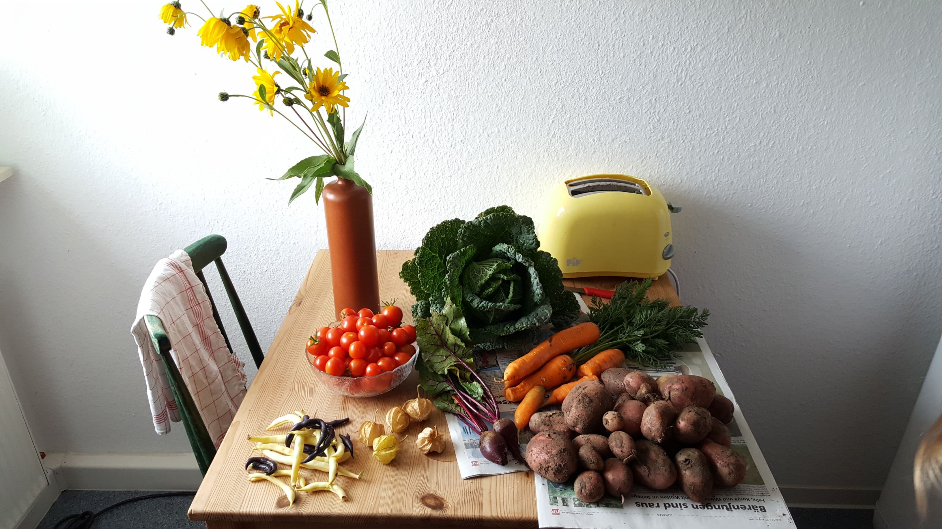 We get back to the question of where these tubers are from. Laura offers some for me to take home. She ordered hers from the forest ranger station and has a sackful of it. I look at her puzzled. Why did she order so much if she does not plan to plant them this year? She willingly admits that they only sell large quantities, because this kind of Topi is supposed to be fodder for boars. Hunters or foresters are using it to attract boars to a certain spot to shoot them. Laura laughs. The boars really love Topi, just like herself, she explains. My reaction shows astonishment. (I leave aside the strange feeling transported by eating fodder for boars that they get to be easier to shoot at a vegan kitchen venue.) Are the fodder tubers really edible for humans? Laura allays my worries by assuring me that she has been eating a tuber every day when strolling through her garden. She really enjoys the chewing sound the tubers make.