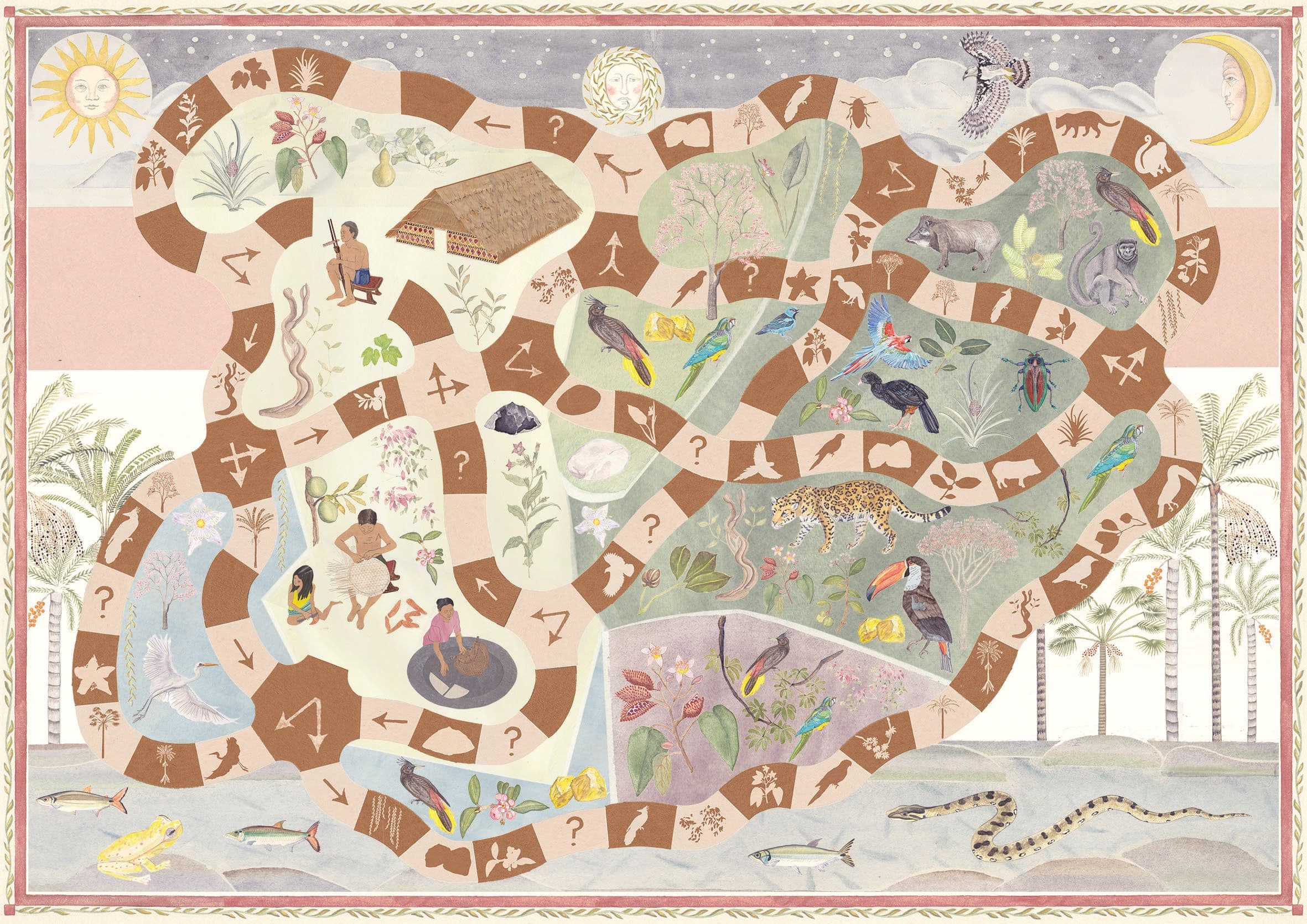 By exploring alternative possibilities offered by the herbarium sheets, Sekulowicz also renders the herbarium as a workshop for her practice as an artist. For example, she recycles discarded herbarium folders into surfaces for her work. Their pastel hues have also provided the colourway for an educational board game inspired by Spruce's collection of biocultural artefacts in the North-West Amazon (fig. 1), bringing to the fore the materiality required by its subject matter. The board game, entitled A'pe-Buese (‘to learn playing’, in the Tukano language), forms part of a teaching and learning toolkit based on Spruce's collections recently developed for the use of schools in the upper Rio Negro in northwest Amazonia (Martins et al. 2021a & 2021b). In this board game, the artefacts have been depicted alongside their constituent raw materials, placed in relevant habitats, to be used as ritual instruments and tools by contemporary Indigenous peoples. In this way, A'pe-Buese subtly brings the past into the present, and returns the herbarium to the forest.